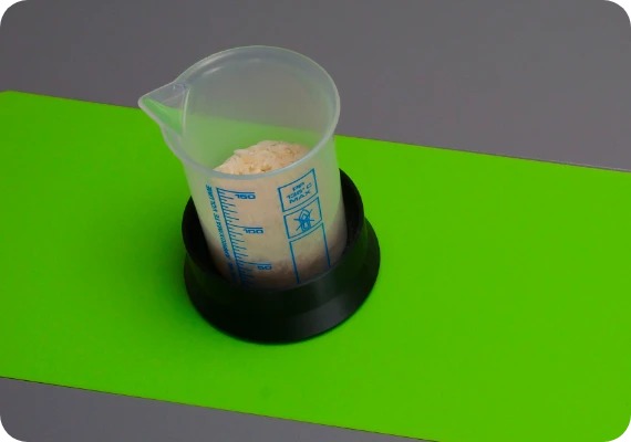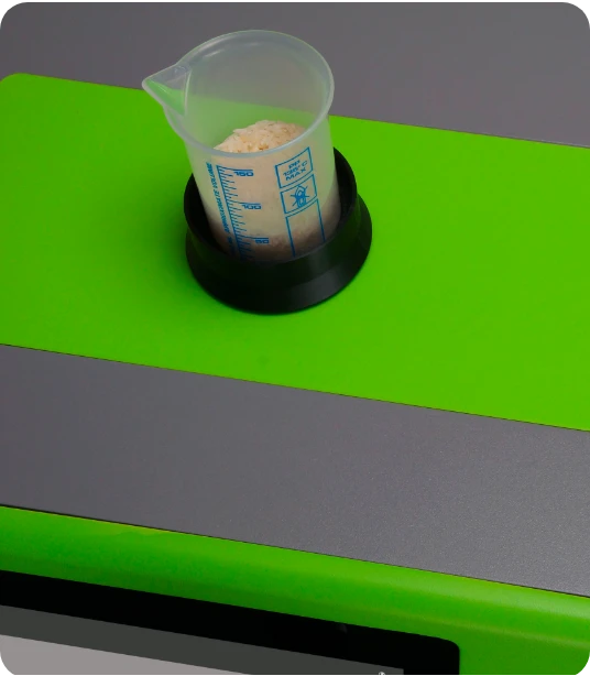 The weight of the sample is determined using the built-in scale. This is necessary to later output the results in weight percentage. The typical weight of a sample is between 25 to 50 g, with samples up to 500 g possible.